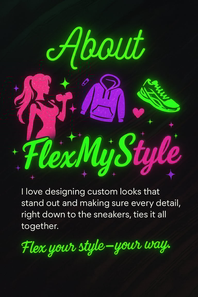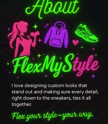 At FlexMyStyle, I create one-of-a-kind shirts, hoodies, and apparel inspired by you — your kicks, your colors, and your personality. From bold neon gym wear to sleek, stylish street fits, every design is crafted to help you look and feel your best.